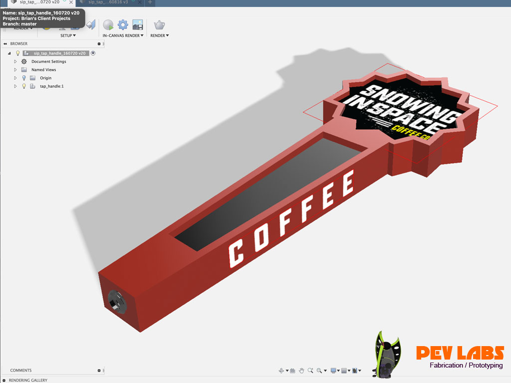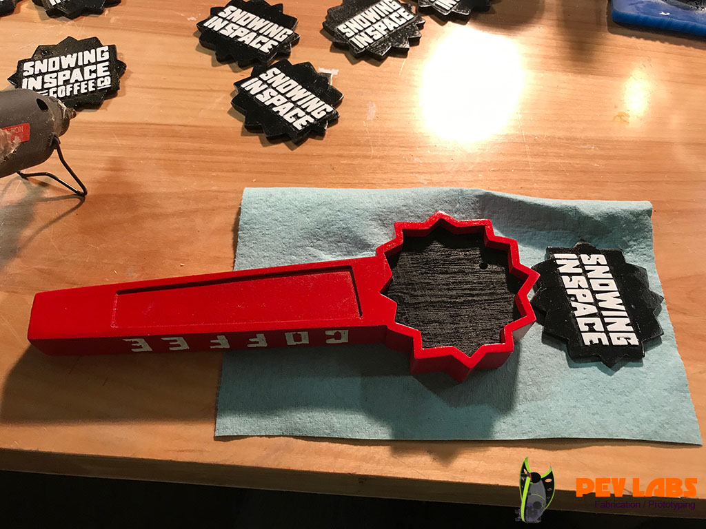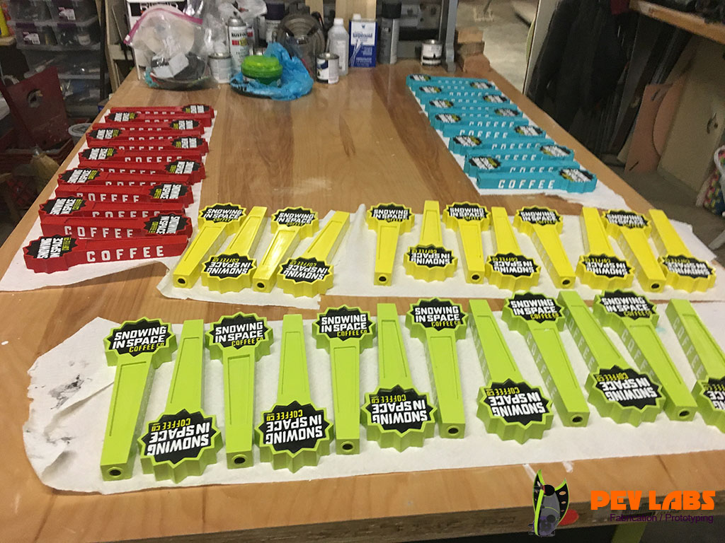 PEV Labs has produced custom branded products for the manufacturing industry and service industry. At least a half dozen different small manufacturing runs of custom tap handles for companies in Virginia and Washington DC. These are often done by CNC milling hardwood for small runs, or using 3D printing to make silicon mold for epoxy resin casting of larger volumes. We begin the process by design a 3D model in AutoDesk Fusion 360. Prices range from $40 a handle to $80 handle depending on complexity and volume. Please note we can not produce several hundred of these per month, but are more than happen do product run of 100 units or less. We an on-demand manufacturer with no minimum order and offer industrial design services if you are in need of some visual assistance. Design costs of $250 gets you three design comps are created based on your branding. You are not obligated to use us for fabrication if we design. We provide CAD files and 3D models if you have a fabricator relationship already in place, or into DIY.