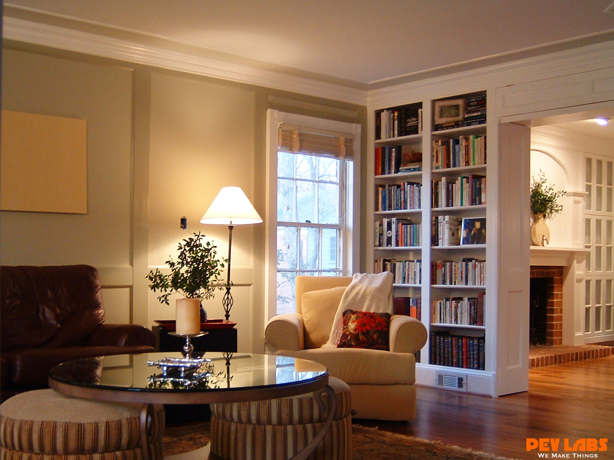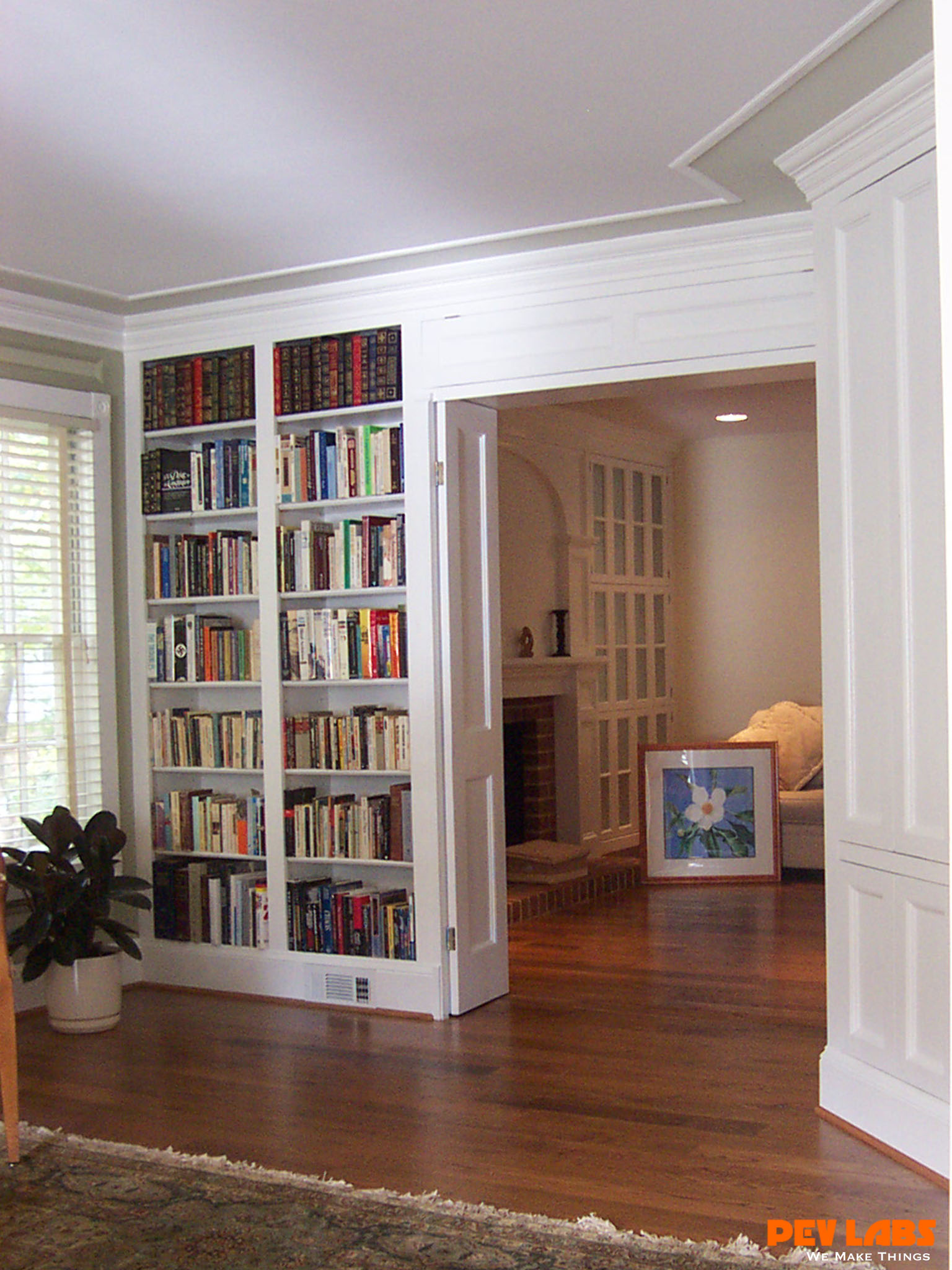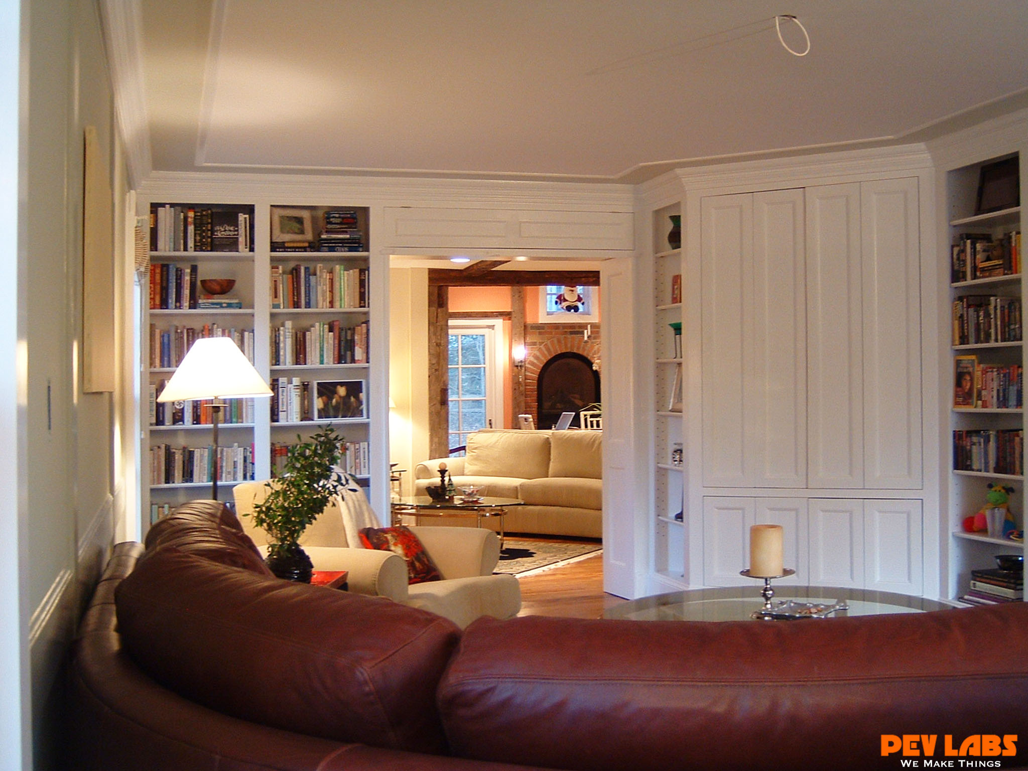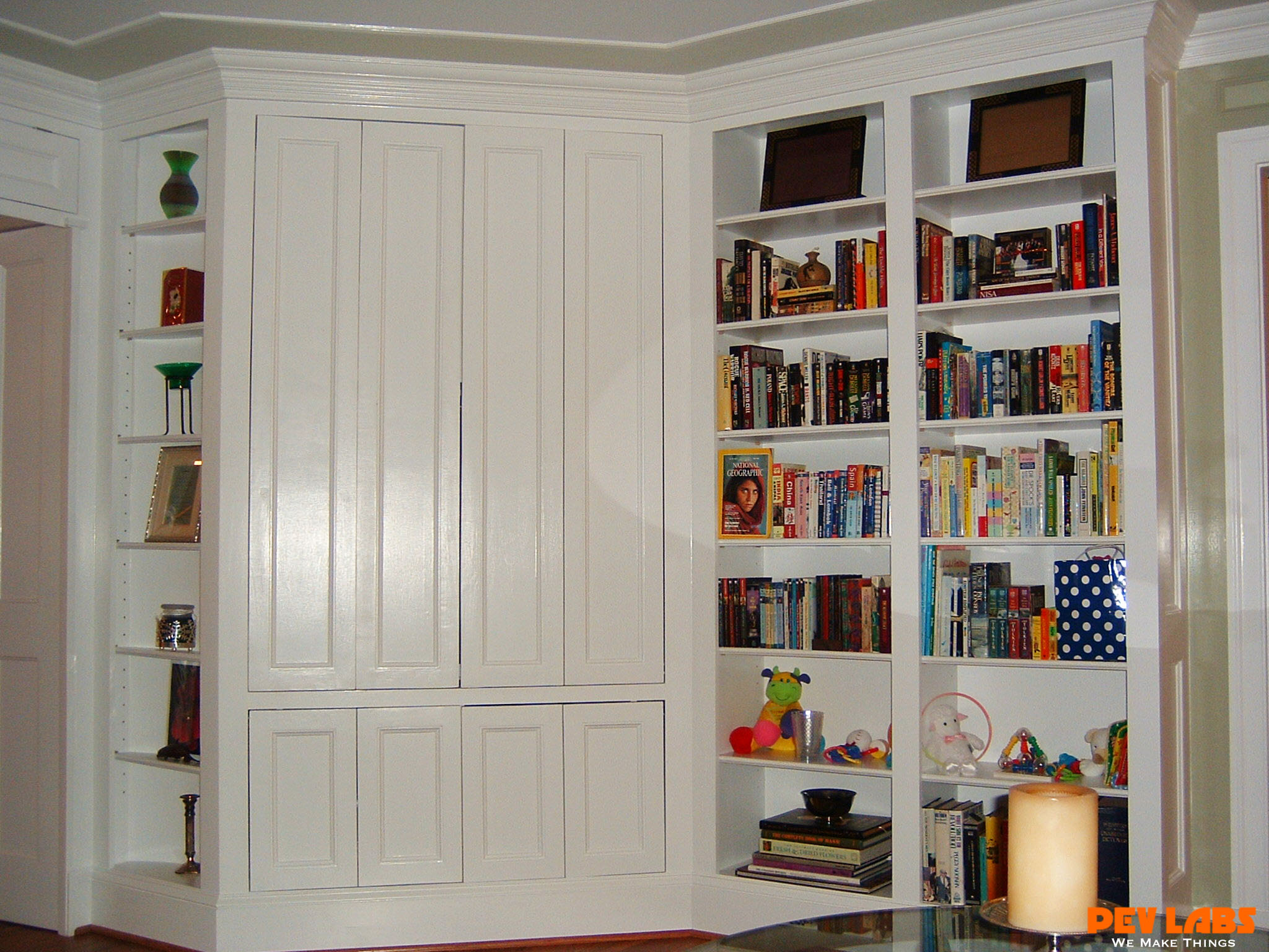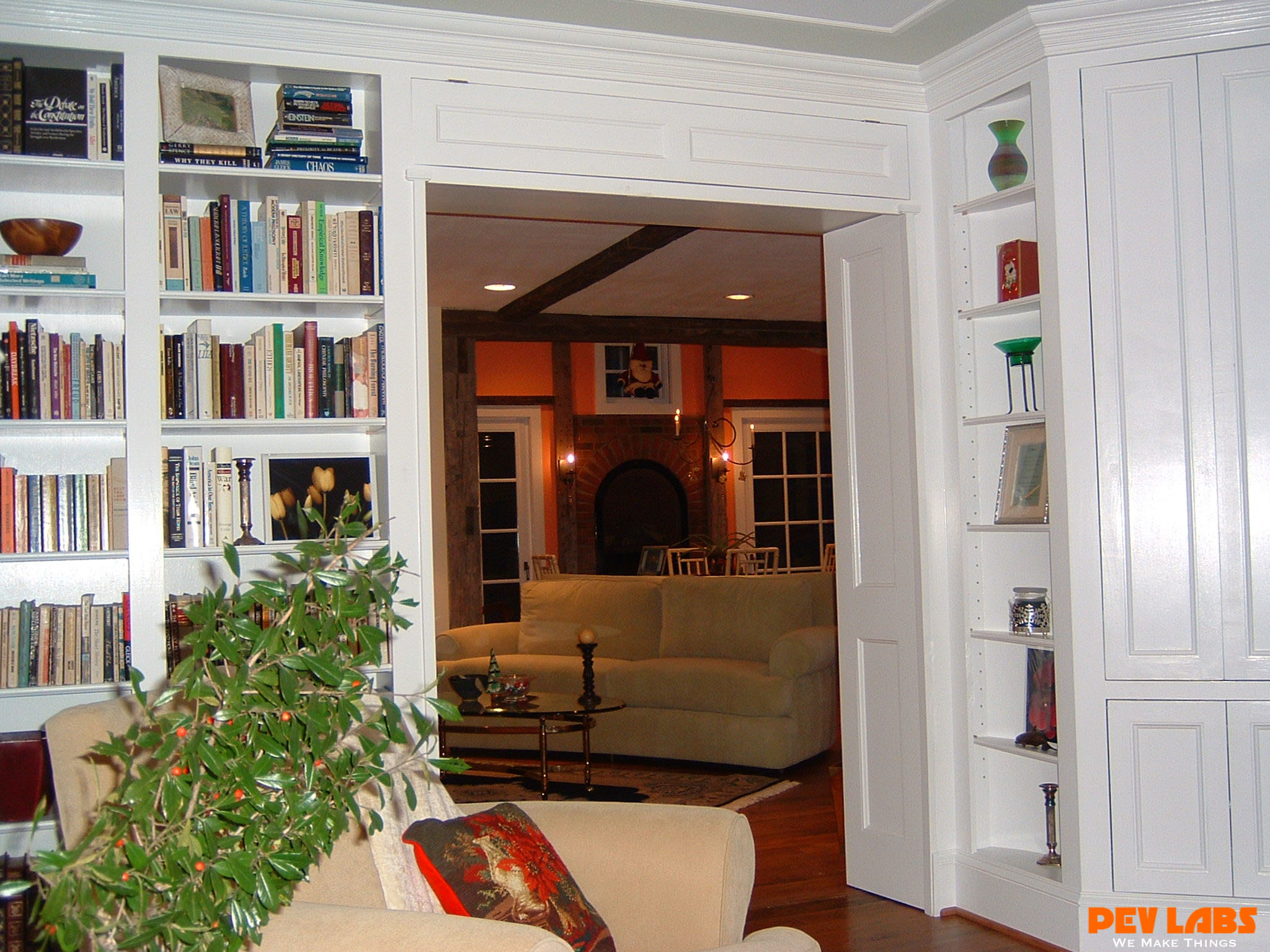 Project demonstrates woodworking, milling and carpentry skills. These dinning room custom cabinetry build includes embedded lighting which offers warm highlights for a room with only two windows. The television cabinet built into the corner not only hides the TV with solid hand made panel doors but acts as a media storage room. The small curved shelving unit on the left side of that cabinet unit is a jibbed door, or hidden door. Though a small open once inside there are small shelves for media such as compact disks and VCR tabes. Addition carpentry work includes a paneled ceiling border with crown moulding and crown backer. Paneled wall trim system, Built-in cabinets are terminated at the floor with baseboard. The archway, or opening from the living room to dining room has jibbed panel doors. These side panels pull out and close off the room for privacy. Please visit our main cabinetry page for more.