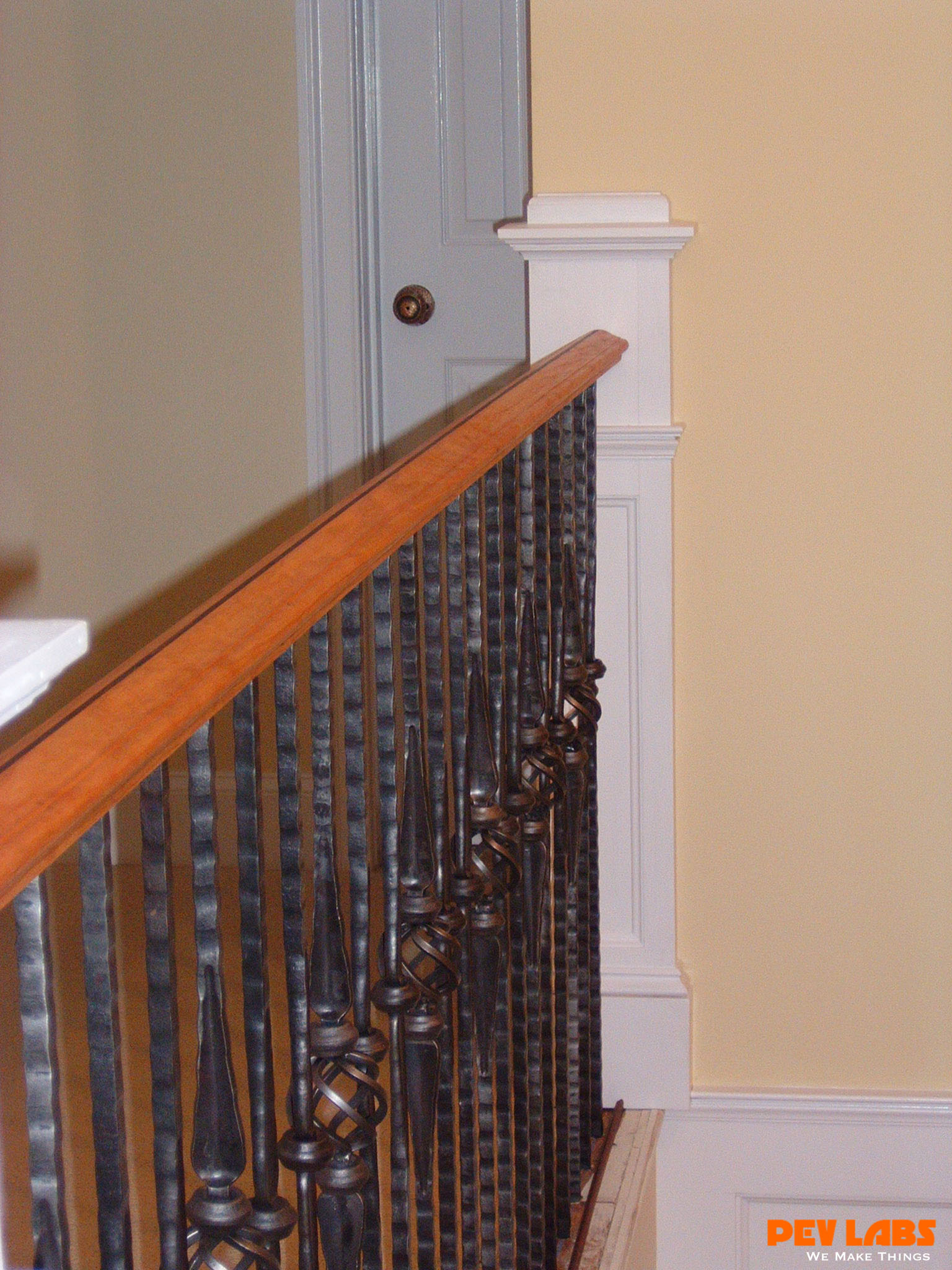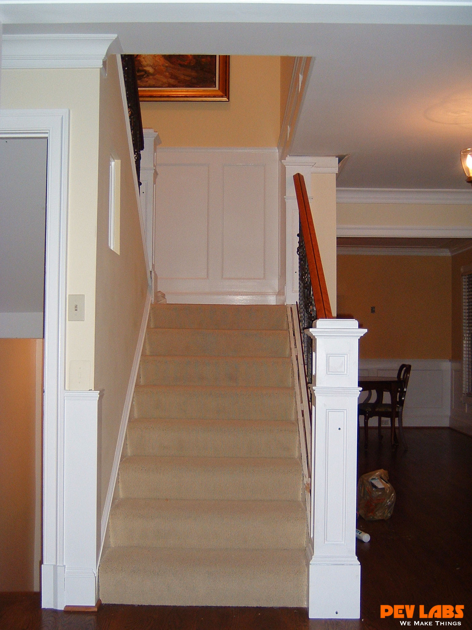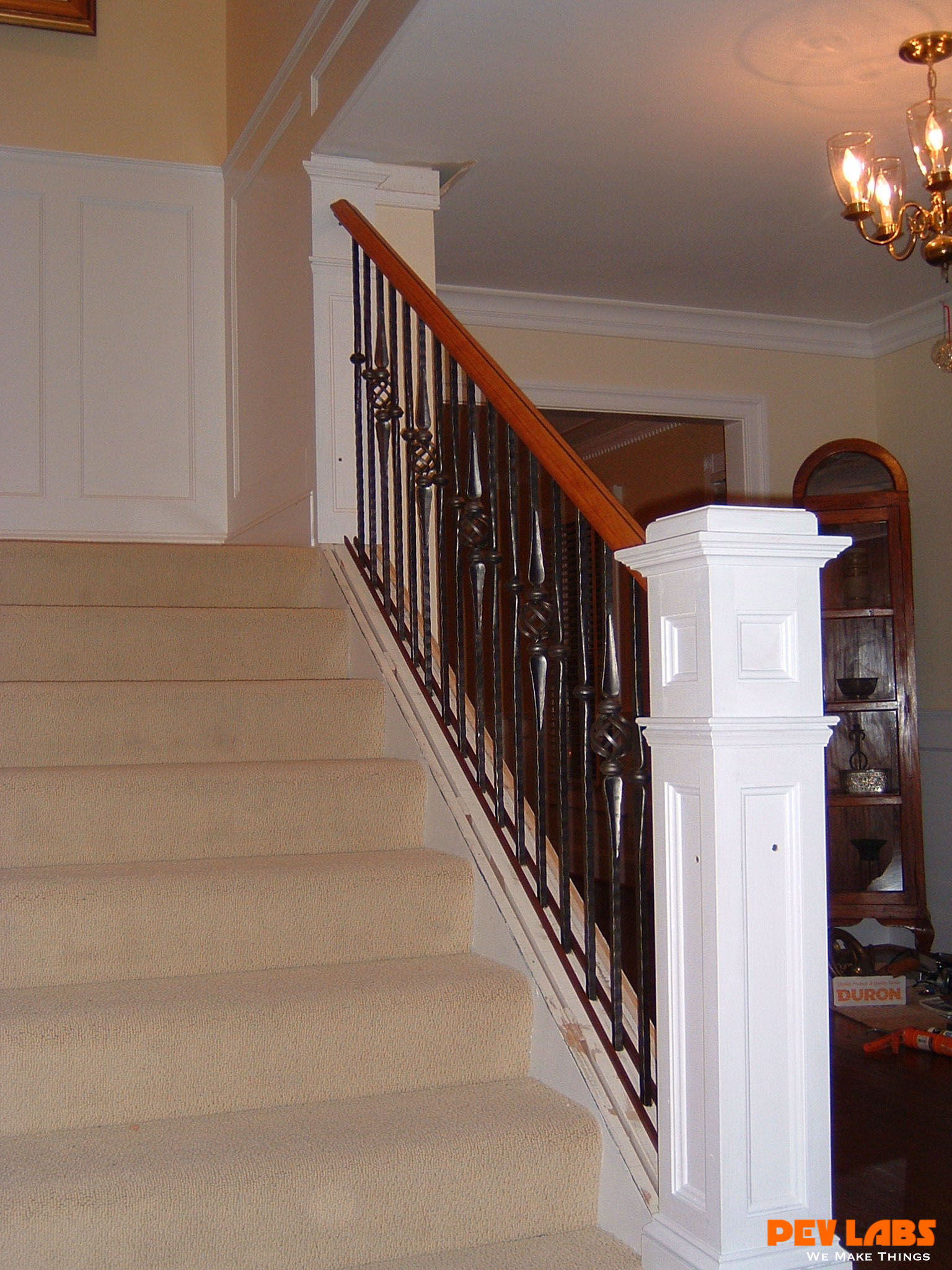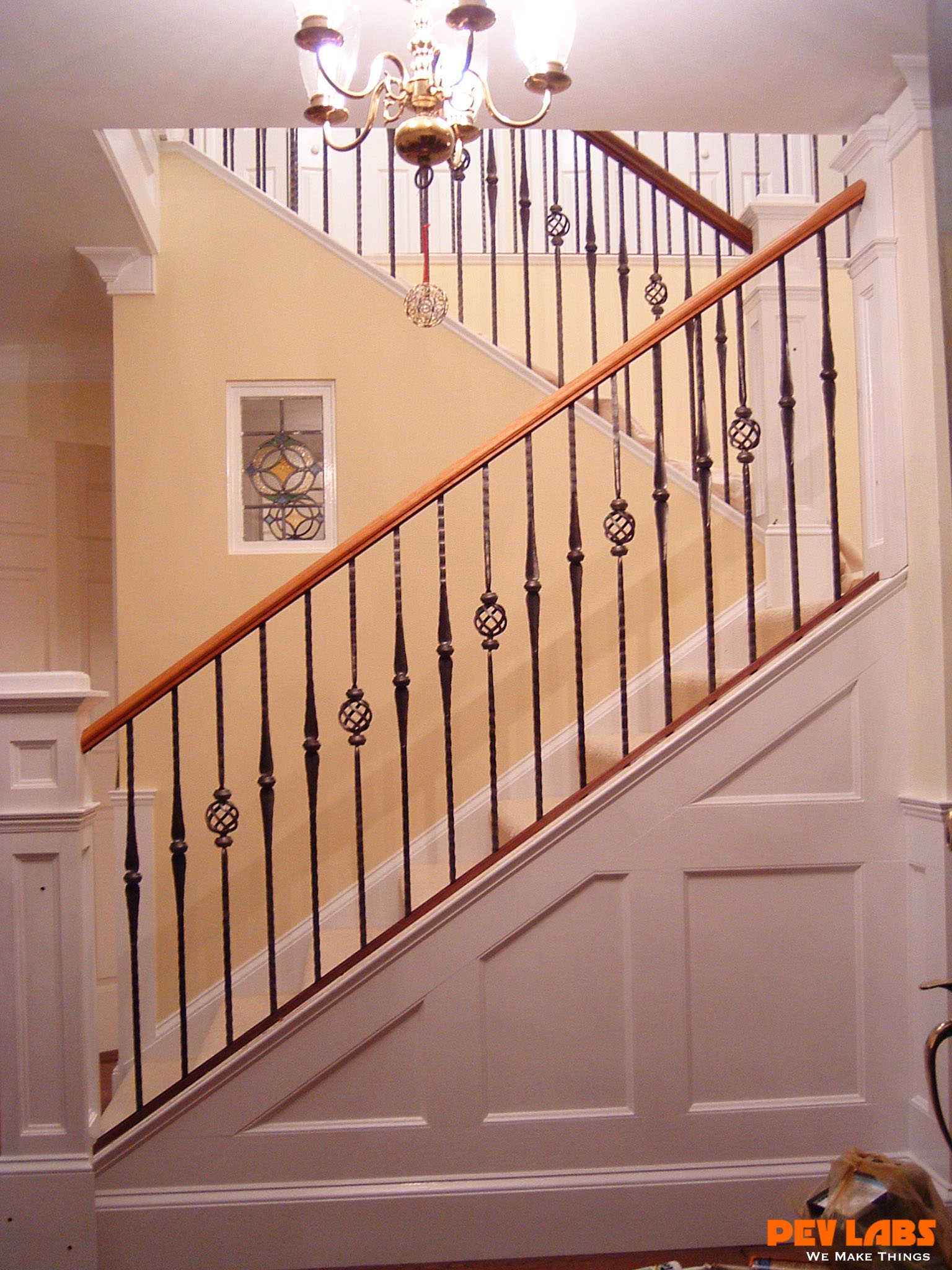 This project demonstrates shop related woodworking, trim carpentry and field carpentry skills as we did the install for the client. The we topped it off with some crown and chair rail molding work The existing staircase railing and modern newel posts were removed to make room for the new balustrade system. Wainscoting was manufactured and adhered to the wall in the foyer and up the stairwell, intermediate landing and on the upper balcony or hallway. A new handrail system was milled up with decorative cast iron pickets set into a custom milled bottom wall cap and skirt board.