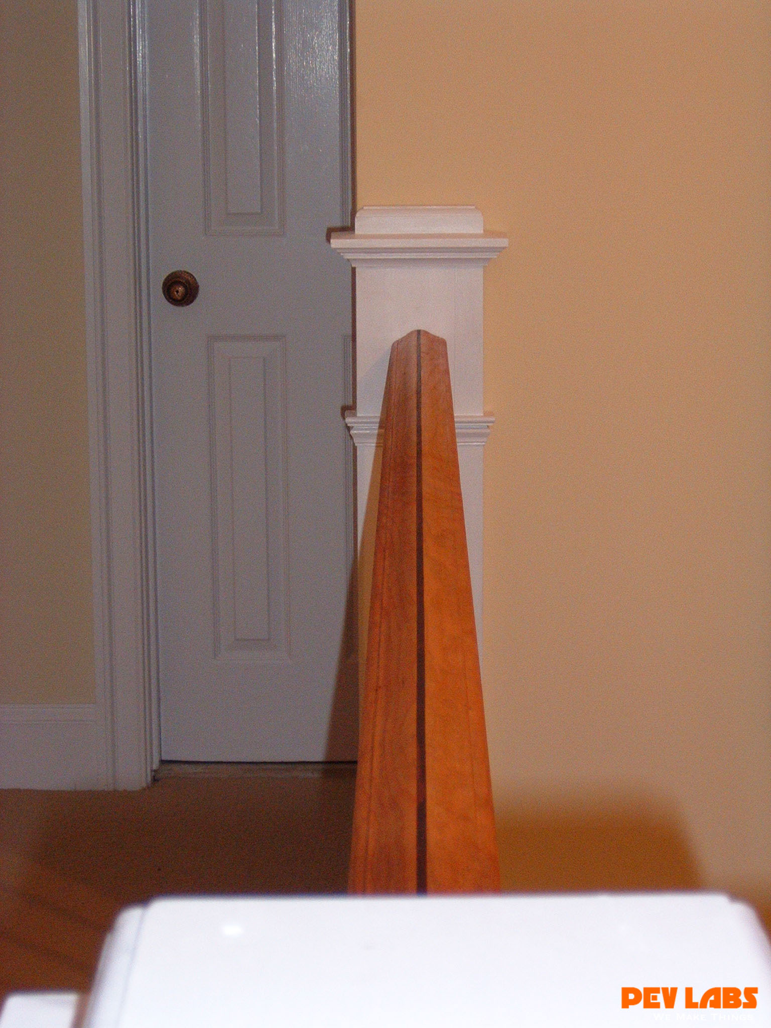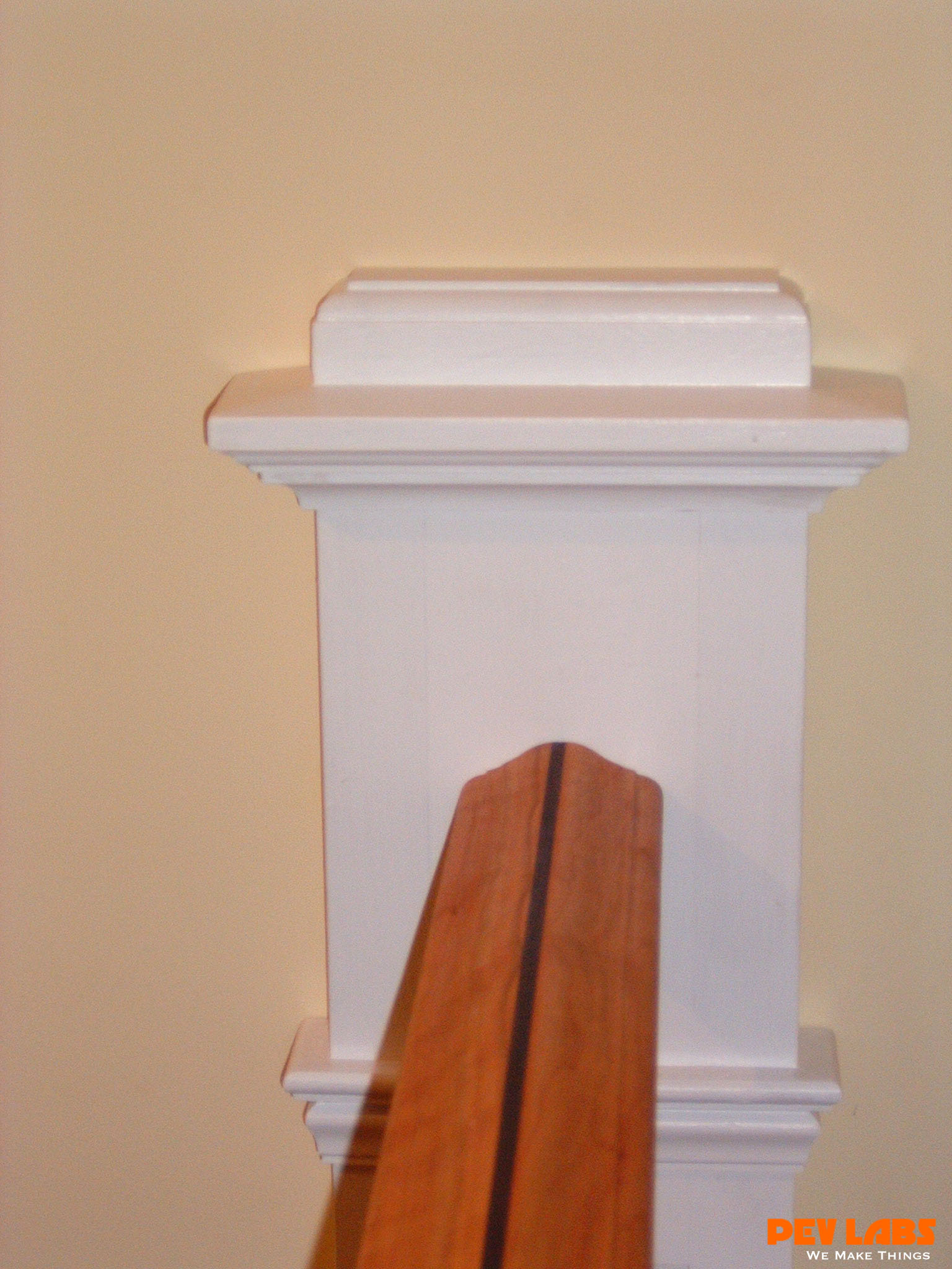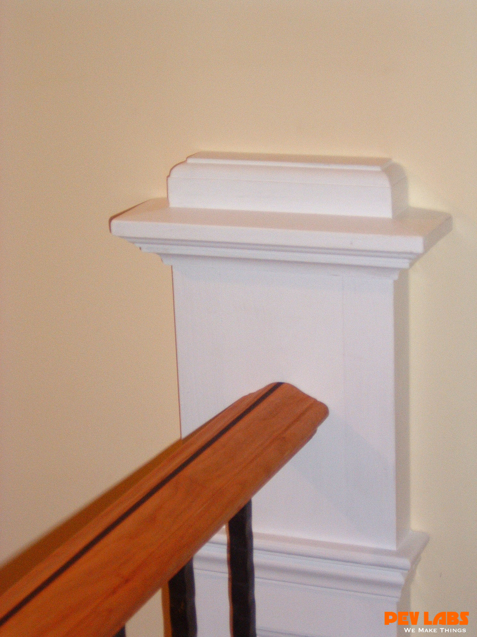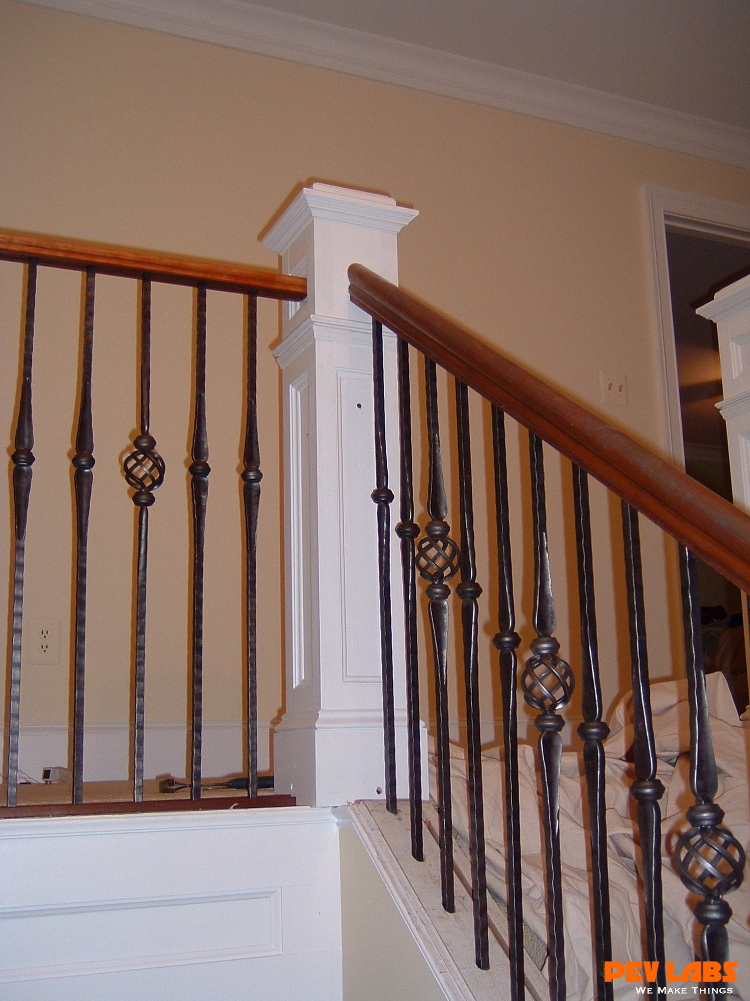 This project demonstrates shop related woodworking, trim carpentry and field carpentry skills as we did the install for the client. The we topped it off with some crown and chair rail molding work The existing staircase railing and modern newel posts were removed to make room for the new balustrade system. Wainscoting was manufactured and adhered to the wall in the foyer and up the stairwell, intermediate landing and on the upper balcony or hallway. A new handrail system was milled up with decorative cast iron pickets set into a custom milled bottom wall cap and skirt board.