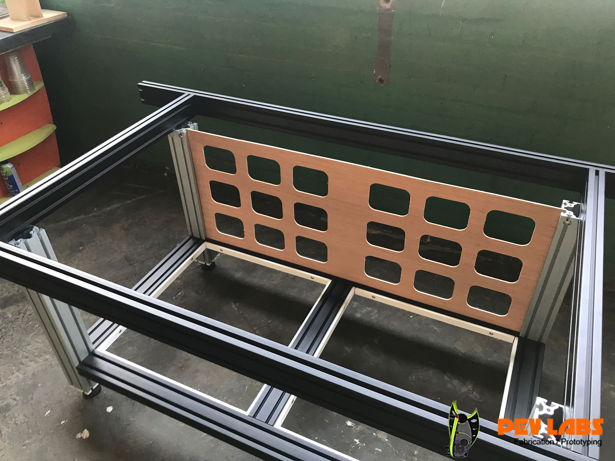 This DIY Laser Engraver project base cabinet will house some of the electronics and cooling system for the laser chassis that will sit a top. Custom shell panels shell are set in the frame grooves which is made of extruded aluminum. Panels of color cored MDF, Luan plywood and polycarbonate. We started in CAD by producing 3D renders from our 3D modeling program, Fusiion360. This DIY Laser Engraver project base frame is utilizing extruded aluminum stock with a mixture of natural and anodized black for a particular aesthetic what we like. The laser base cabinet has polycarbonate wall material inset in a uniquely designed framing support. The framing panels slide into the T-slot tracks prior to fastening the base top. The clear plastic panels can be removed at any time for servicing or expansion. Window panels are secured with anodized knurled thumbscrews. Floor panels have a unique CNC milled pattern and logo engraved which also matches the side branding.