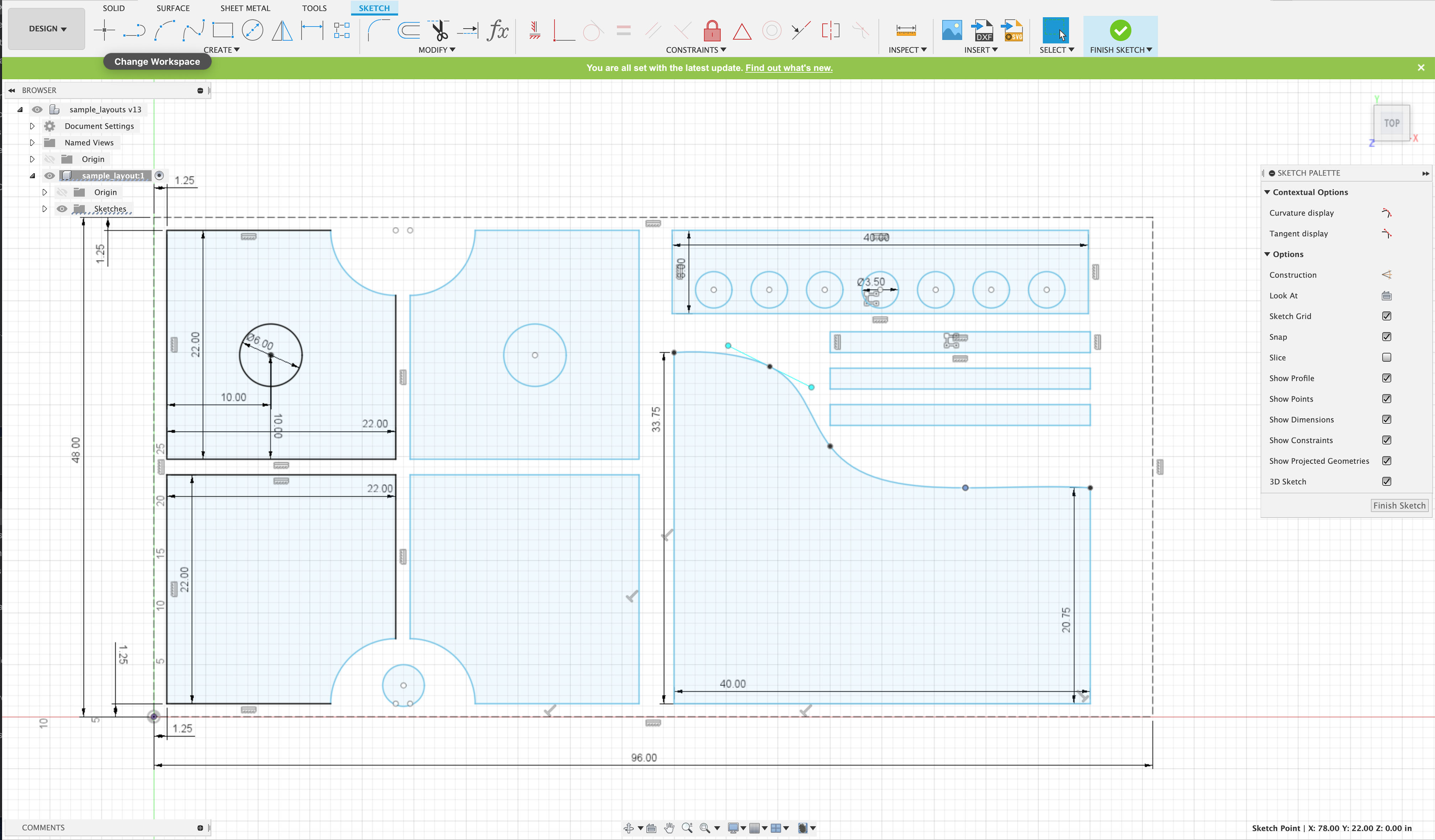 Here is a sheet stock layout example. The dashed outline is a 48x96 inch sheet goods. This lets you know how many parts will fit on a sheet. If the sheet is plywood it lets me know the direction you want the grain on each part. The grain runs the long direction. If you rotate any given part by 90 degrees then that will change the grain direction. For paint grade material this would not be important. Note I have left at least .5" spacing around the edges and between the pieces as shown here. I need room to clamp down the stock. The end mill will make the material in its path disappear. Then we need some webbing so the material does not fall apart during milling.